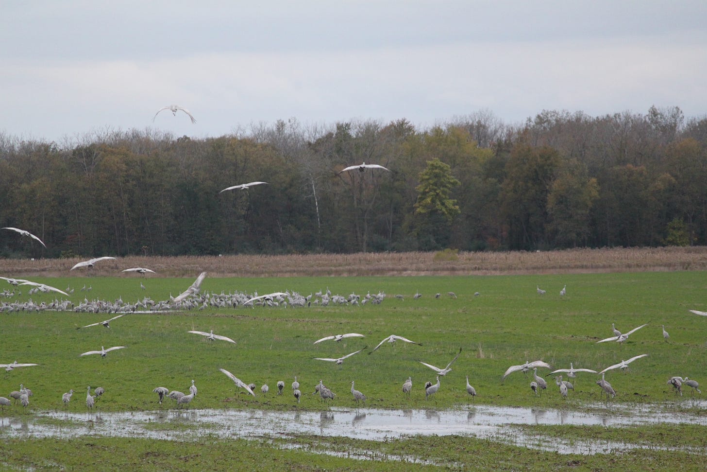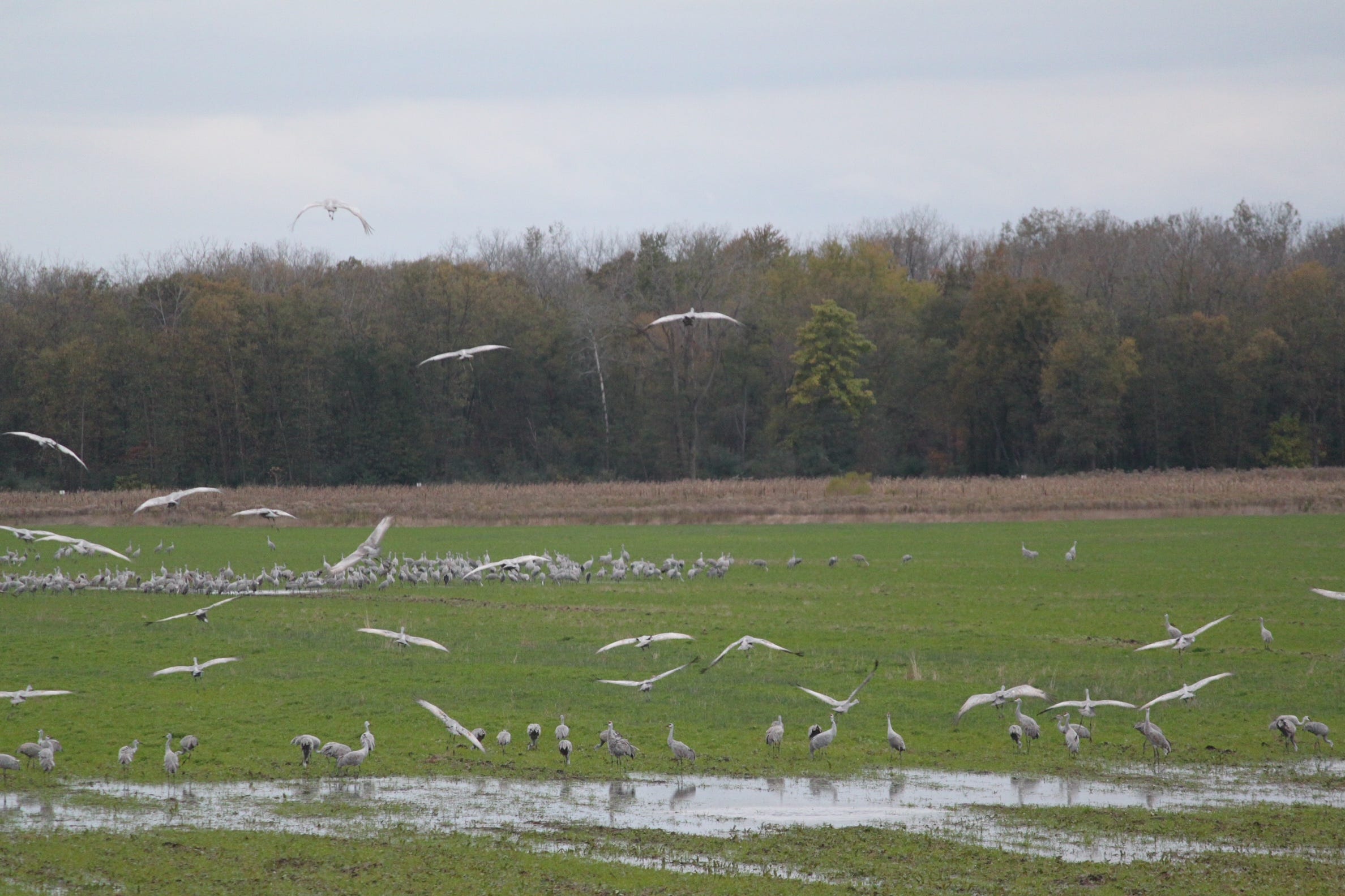 These characteristics create an ideal pitstop for “a significant portion of the region’s [sandhill crane] populations” on their migration from Minnesota, Wisconsin, and central Canada to wintering areas in southern Georgia and Florida, characteristics that are not found at other preserves across the Midwest. This current combination of food availability, space, and safety keeps the cranes returning year after year.