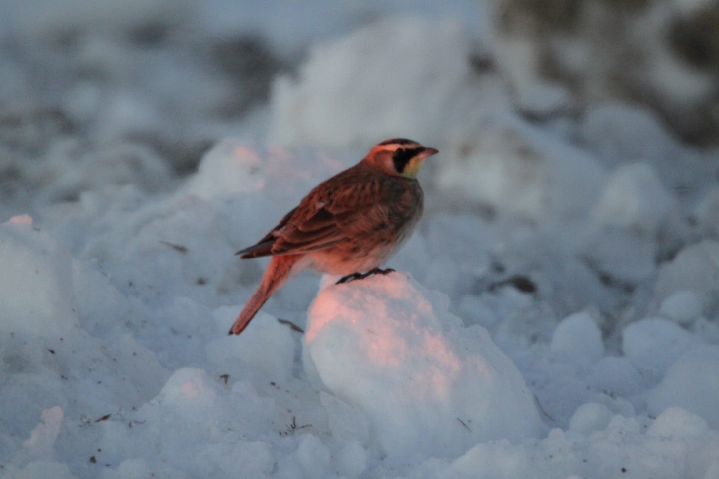 The first birds weren’t just any birds, they were Horned Larks, one of my target species. These are year-round residents in rural Illinois and a treat any time they’re encountered. Not much bigger than a sparrow, Horned Larks are handsome birds of barren fields all across North America. They have a lilting flight and a pleasant call interrupting the absolute silence of snowy expanses. This was an agreeable group that would fly out into the corn stubble only to circle back around right in front of my car.