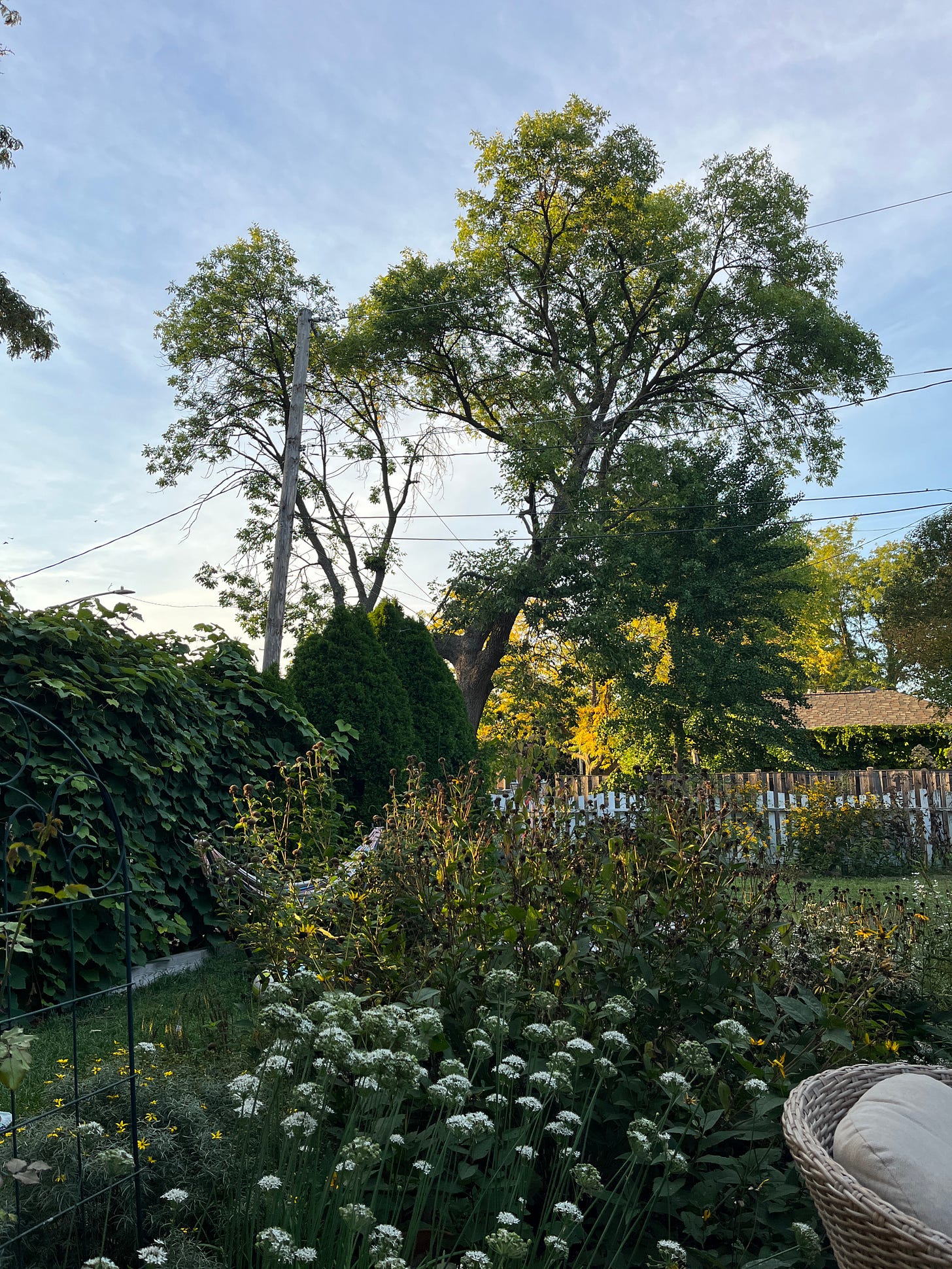 An unidentified warbler appears in the neighbor’s elm. It sticks to the treetops in dim light. No one said this would be easy.