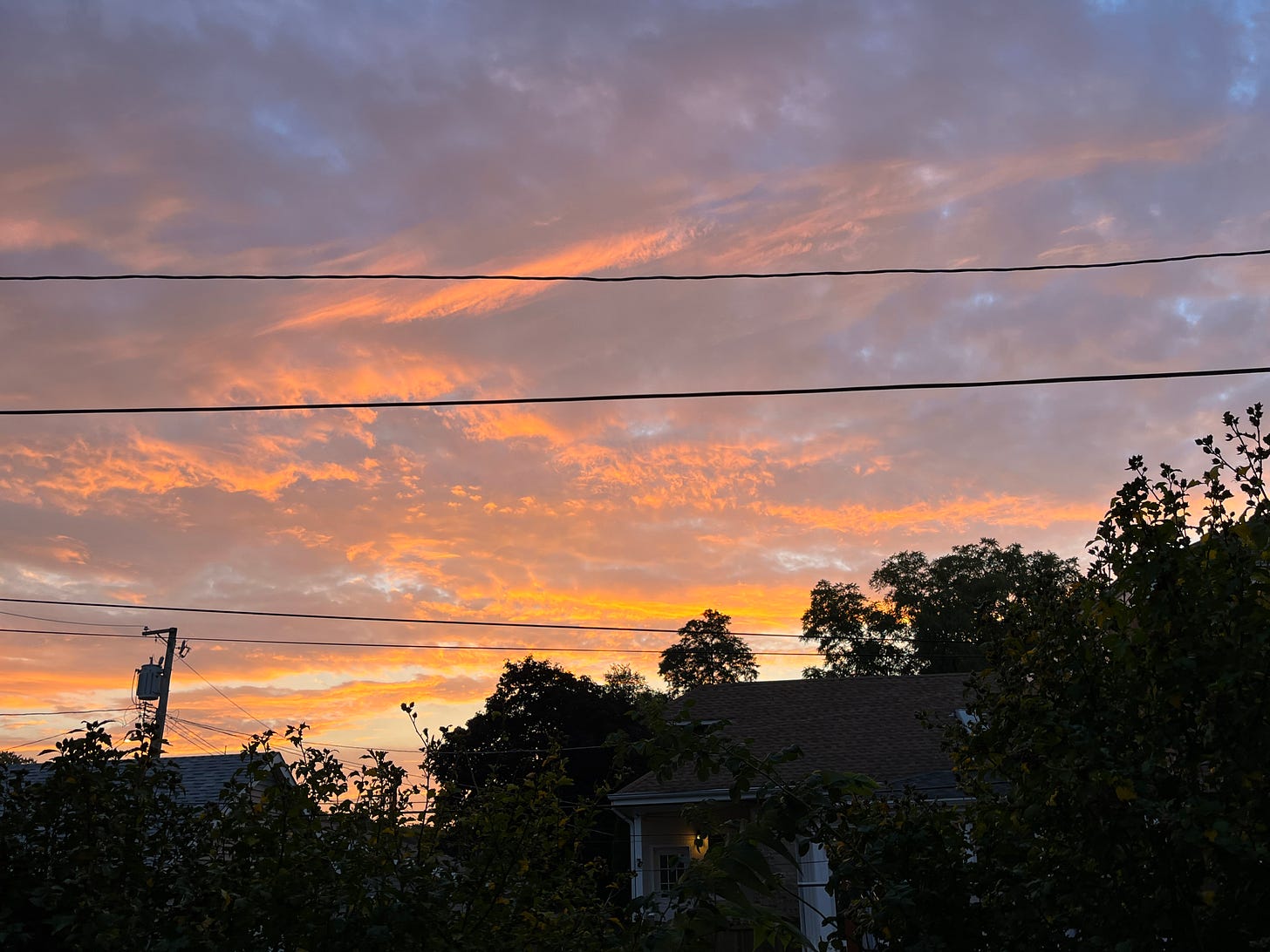 It’s shaping up to be a beautiful sunrise! Flecks of blue sky appear between layer of golden clouds.