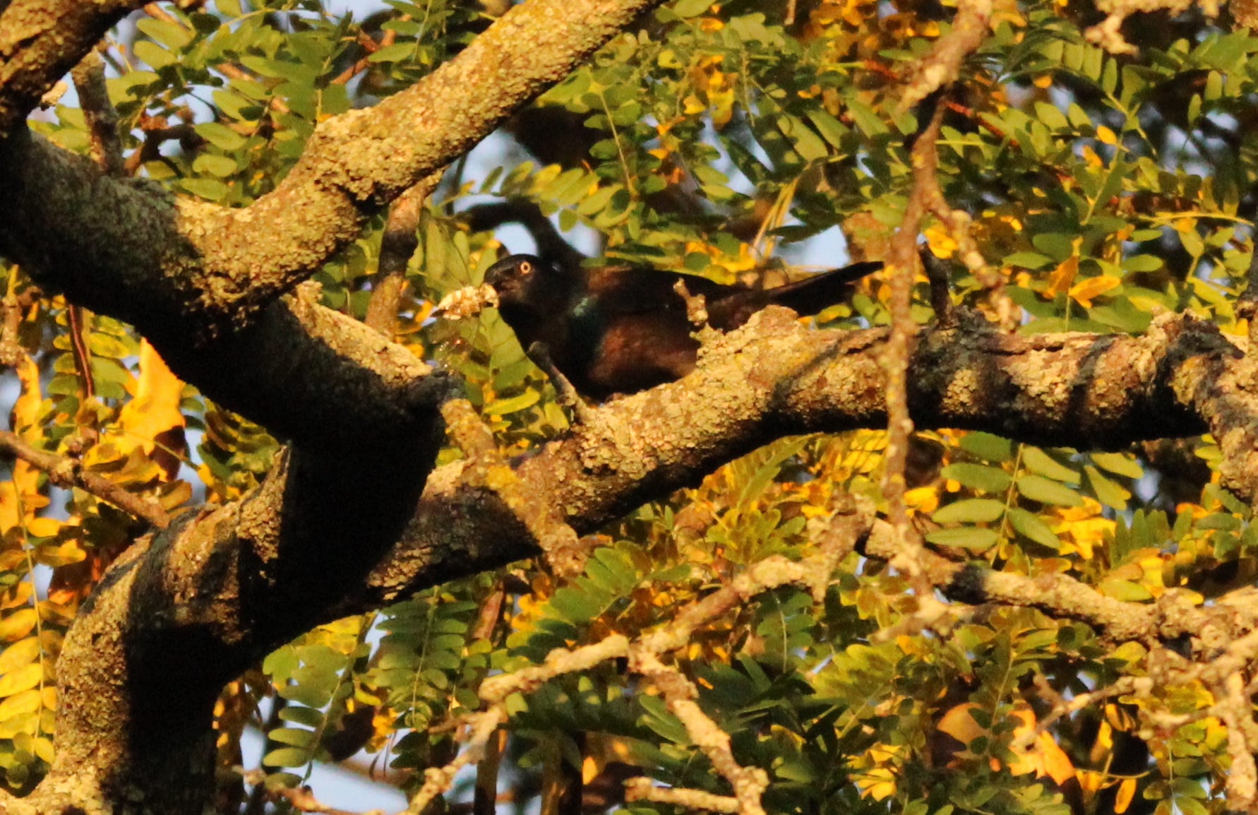 Common Grackles alight at the top of the nearest Honey Locust, as they’ve been wont to do since February. Now they are dropping into the mid-level of the tree, and I realize they’re looking for cicadas (with some success) on the smaller branches. Such resourceful birds.