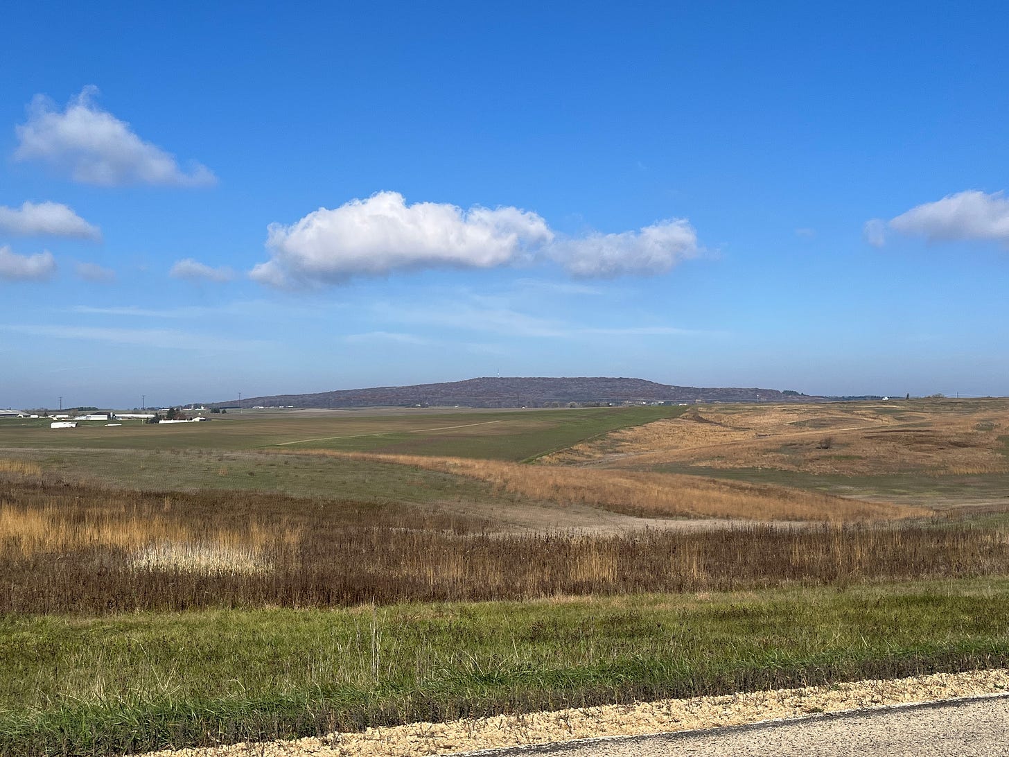 The highway crosses into Dane County, home to Madison and the University of Wisconsin. We’re in the big time now. I espy the famed Blue Mound—the highest point in southern Wisconsin—off in the distance.