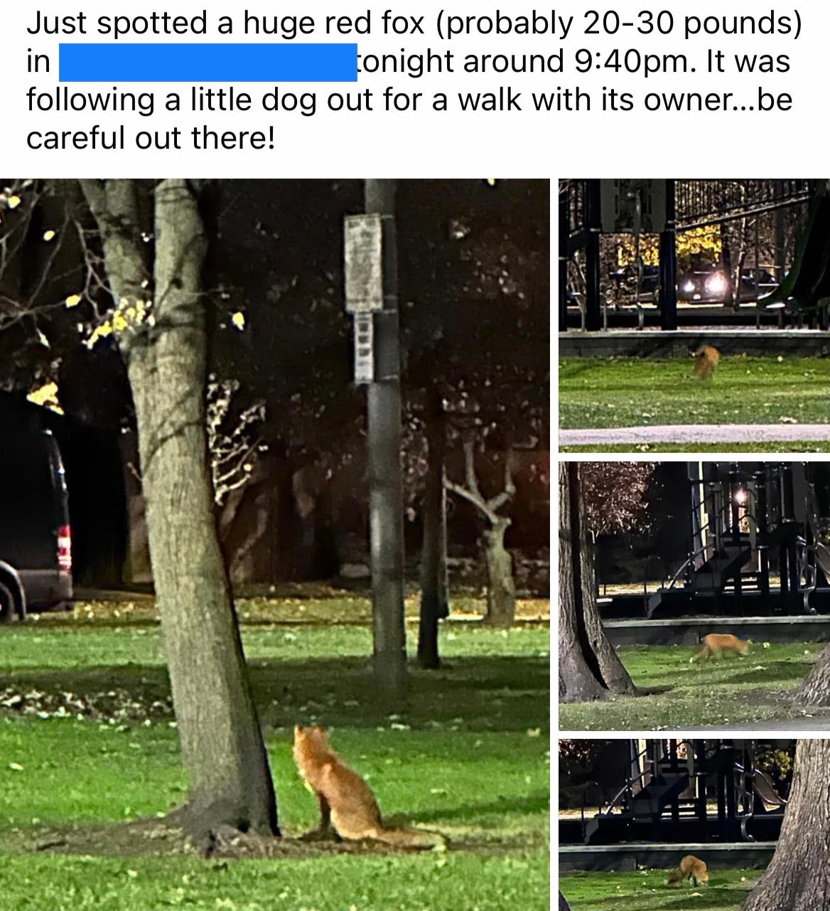 Ye gods, here we go again. The concerned Facebook poster has this sort of “what’s in it for me” mindset when encountering nature or something unfamiliar. It’s the idea that nature is something that needs to be feared and controlled rather than appreciated. Would the fox really pounce on the little dog in the bright lights of a city park?
