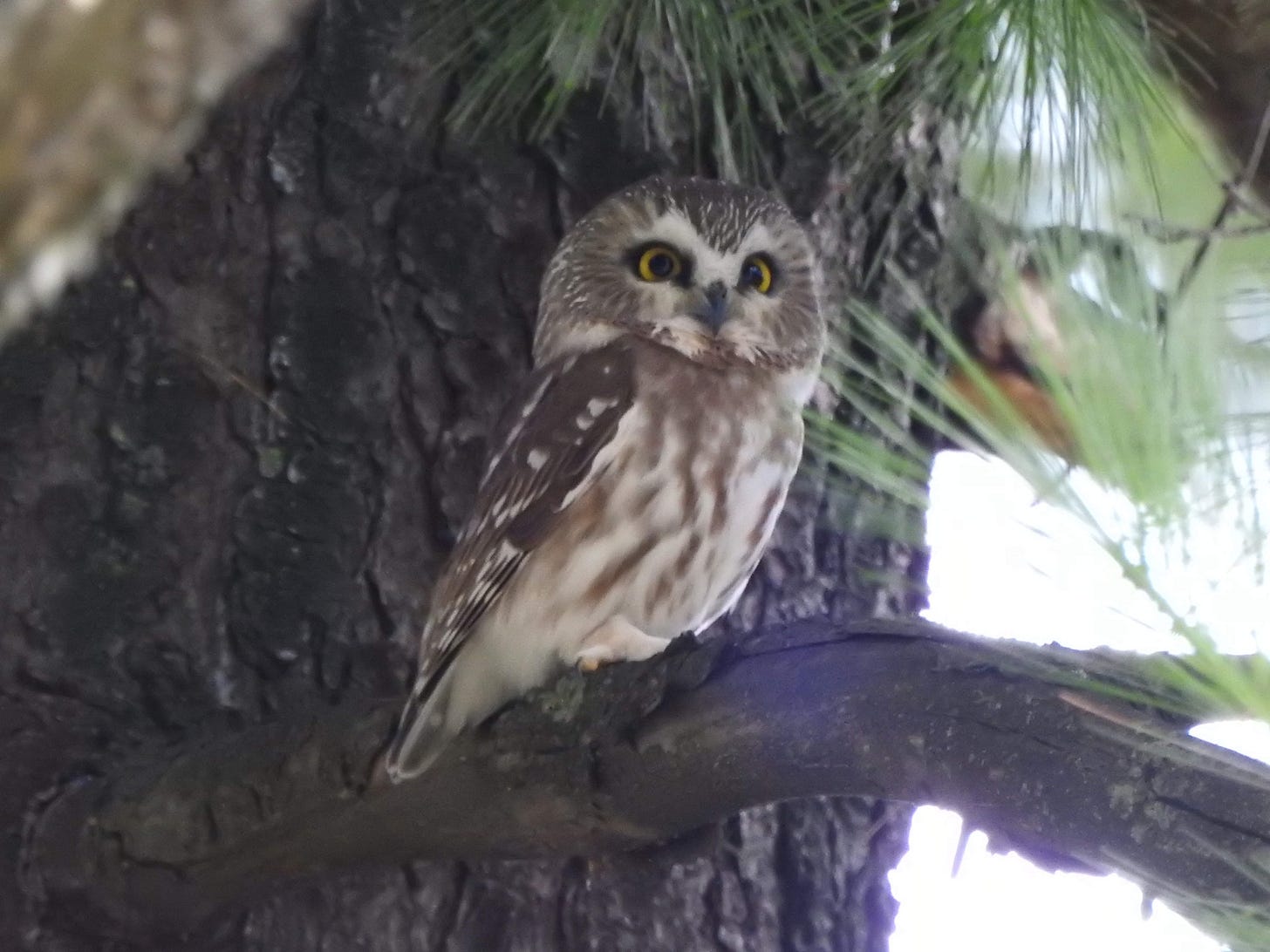 The New York owl, now nicknamed Rockefeller naturally, came from a Norway spruce. Chicago’s tree is a blue spruce, so there isn’t much of a difference there. Saw-whets often turn up in cedars, too. But there’s also a very high likelihood of not finding a saw-whet in a conifer, and they even prefer vegetation like buckthorn that pervades some parts of the Chicago area. Again, they can still be hard to observe due to their size and behavior.