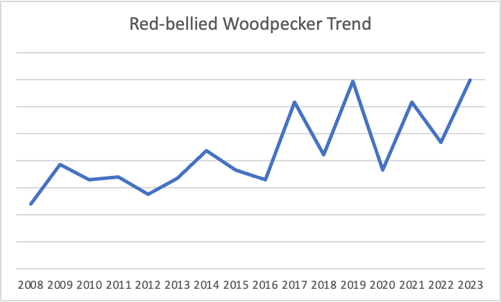 Rising woodpecker numbers have been a theme for years in Chicago-area Christmas Bird Counts. This year’s count in the Southwest Suburbs proved to be no exception. The count on December 17 resulted in a new record for Red-bellied Woodpecker—350 individuals topping the previous mark of 347 set in 2019. As recently as 2008, Red-bellied Woodpecker numbers were at just 119.