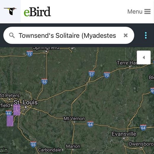 Every year a few Townsend’s Solitaires make their way east from their Rocky Mountain haunts (in fact there was one seen in McHenry County this past weekend). They feast on juniper berries in wintertime. It just so happens that the fissures and joints of Illinois’ sandstone outcrops are perfect for junipers. One can hope a few more of these nifty thrushes make their way east.