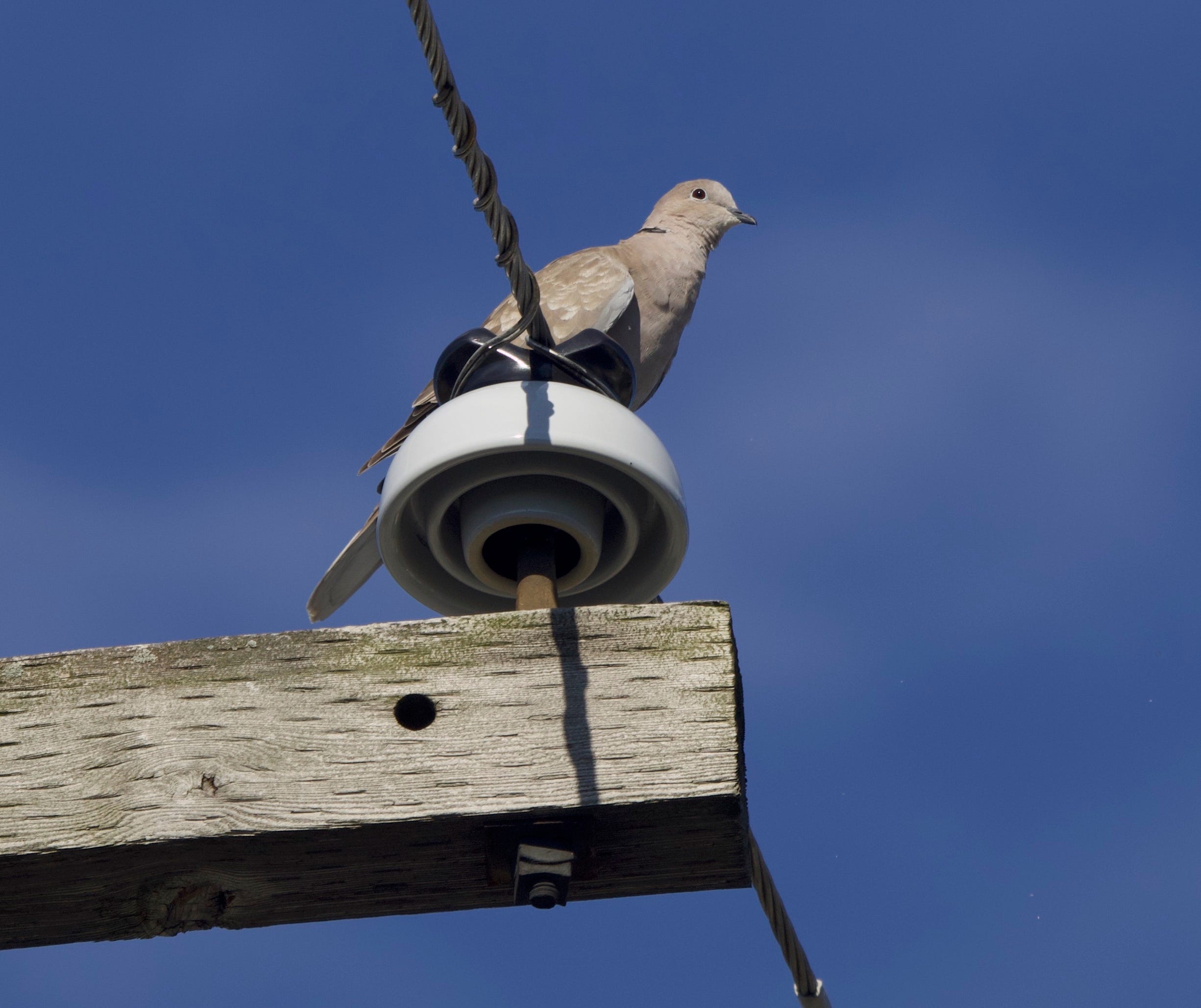Until recently, Eurasian Collared Doves in our little enclave north of Elston have been rare. Something about the diagonal thoroughfare, maybe the surfeit of hot dog stands, has kept them south. This summer, though, two or three have been hanging around our yard and a few other nearby side streets. They provide a modest diversion when one has grown overly familiar with the many Mourning Doves and Rock Pigeons. They’re bigger than Mourning Doves, with a large squared-off tail and the namesake collar. The males give the distinctive koo-KOO-kook song to defend territories and attract mates. They sound a bit like Mourning Doves that are out of breath and a little wheezy.