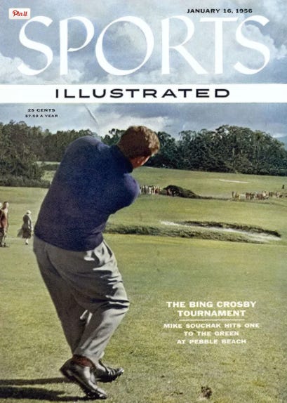Of course, this article arrived in a time when Sports Illustrated also covered dog shows, deep sea fishing, rodeos and scuba diving. It was like the major sports weren’t as major back then, and that on some days a story about archery may receive the same notice as the NFL championship. The January 16 edition featured a spread on “The Bing Crosby Tournament” and golf at fabled Pebble Beach in California.