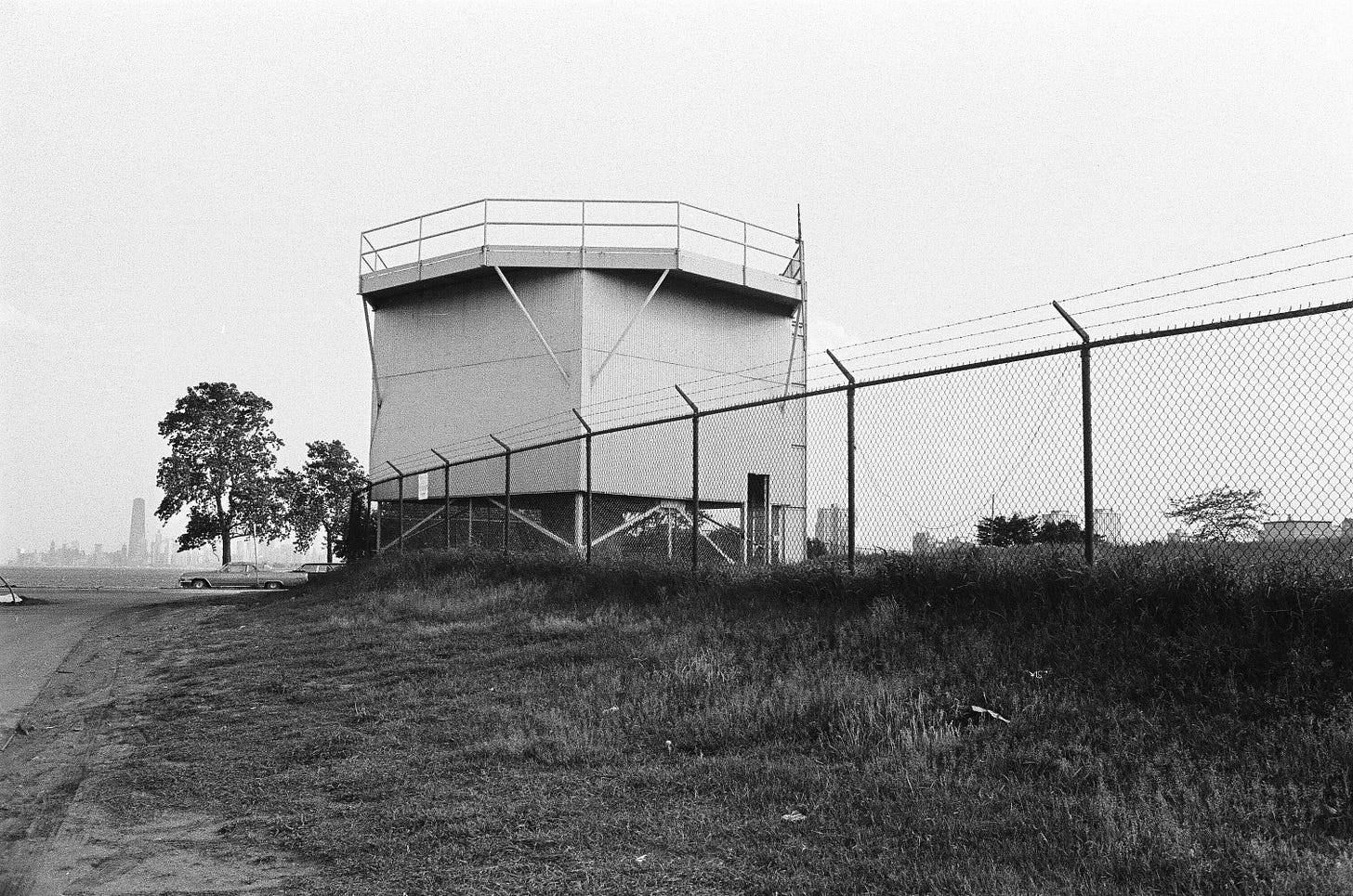 Other installations in the Chicago-Gary defense ring offer some clues, though. They likely were simple one-story rectangular structures that served as residences and administrative buildings. Radar towers were large and spherical in shape; the launcher areas, like the one at Belmont Harbor, look like mini airport runways or tarmac. In Barrington, Illinois, part of the Palatine installation, a 1968 image shows what a barracks looked like a few years after closure. There are a few scattered trees and some overgrown shrubs and not much else. Nothing here suggests a hedge was a standard component of missile site landscaping.